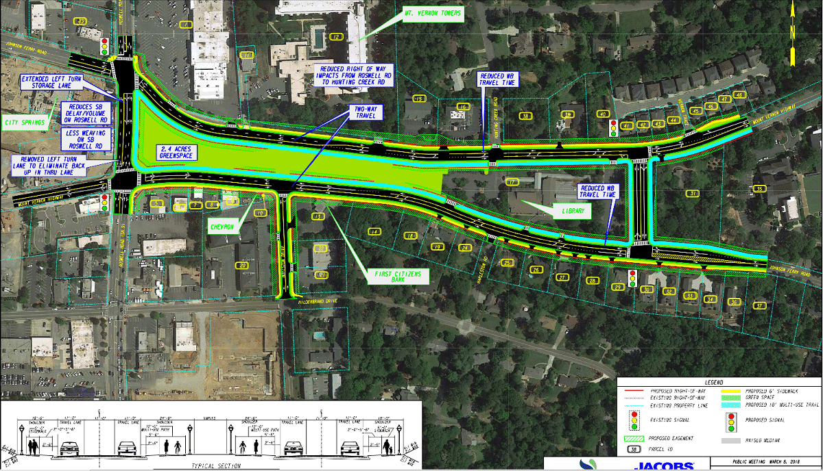 To maintain connection between Mount Vernon and Johnson Ferry for crossover traffic, a new road would be built through the park at the eastern end of the library property at 395 Mount Vernon Highway N.E. The road would have two lanes in each direction and a new traffic light at both ends. Without that road, drivers would have to use Glenridge Drive as the crossover spot instead.