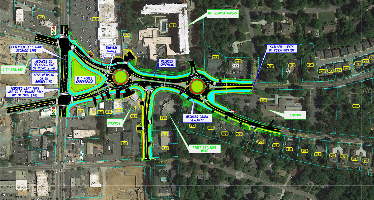 In the grid concept, the intersection would be eliminated, with Mount Vernon and Johnson Ferry reconfigured as separate streets running parallel, though very close together, through that area. Boylston Drive would end there in a T intersection rather than going across both streets.