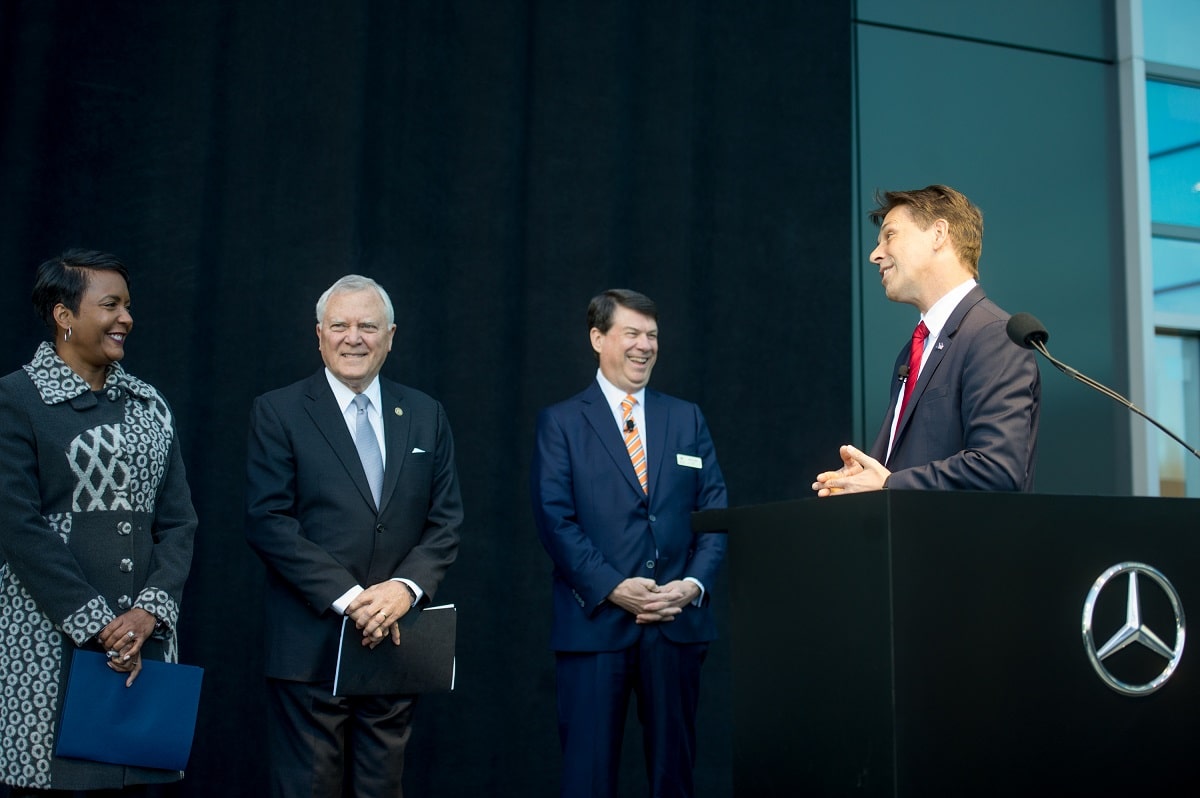 “It’s pretty difficult to top the seal of approval to the business community of the world than to have Mercedes-Benz decide Georgia is where they want to have their North American headquarters,” said Deal in remarks to a crowd of roughly 200 guests at the glass-walled complex at Sandy Springs’ Abernathy and Barfield roads.