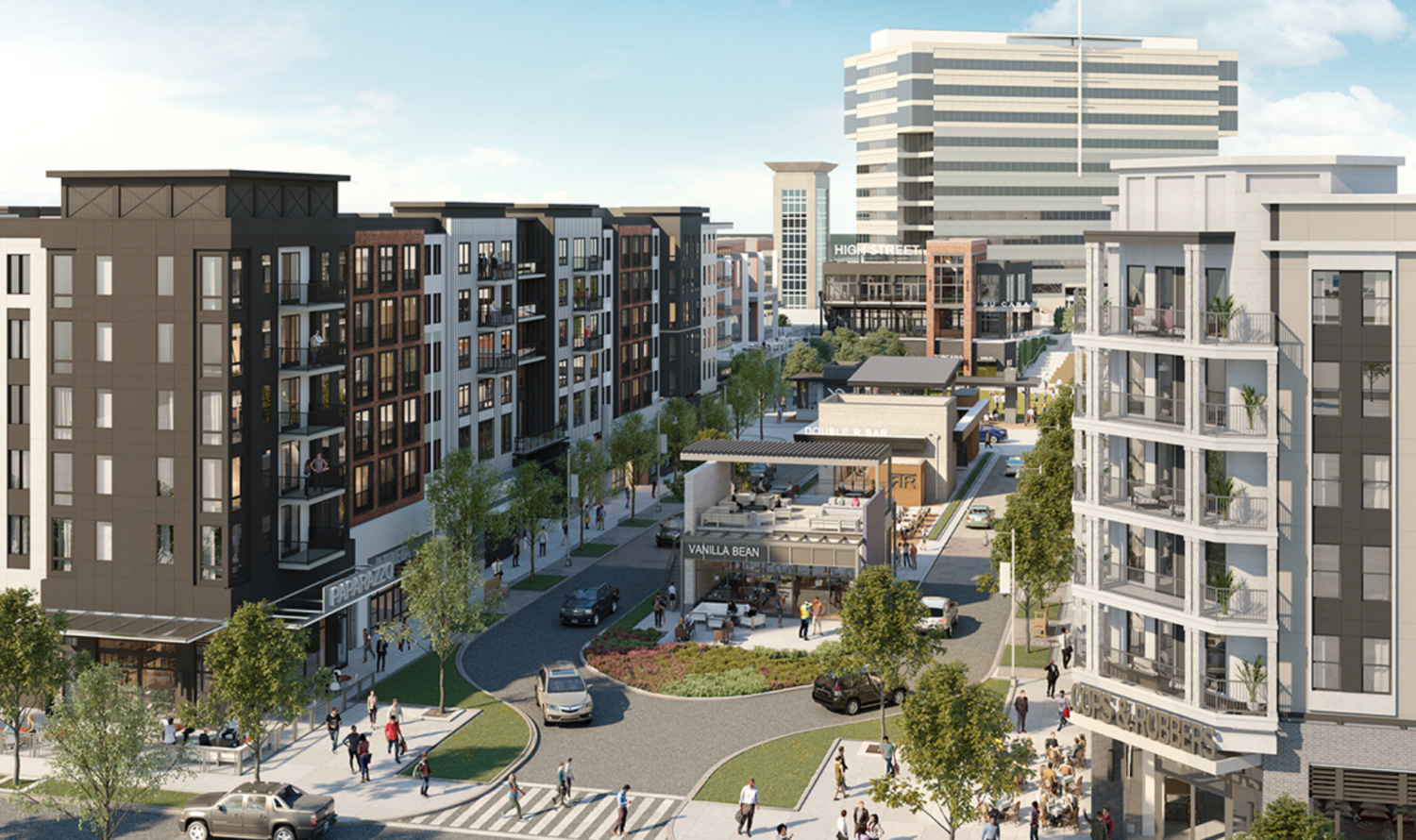 The first phase encompasses about 17 acres and is expected to cost about $230 million. This portion of High Street would include 598 apartments in two residential buildings; 199,000 square feet of retail including a luxury movie theater; 40,000 square feet of new office space; 2,279 parking spaces; and about a ¾-acre public green space in the central area where GID envisions community events such as concerts or yoga in the park.